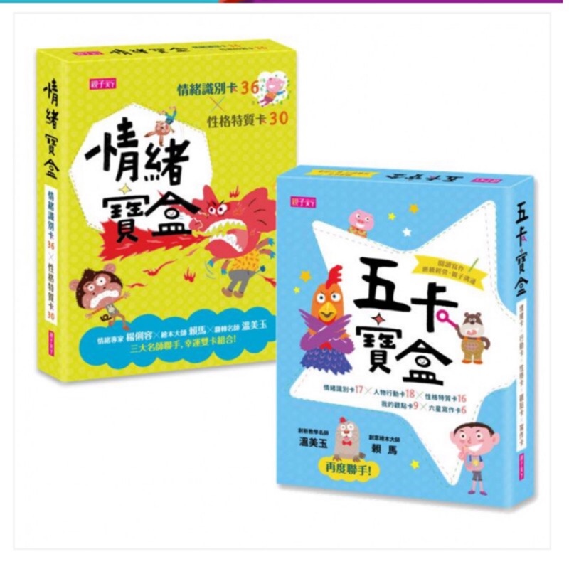照片中除了《情緒寶盒》的卡片,還有姊妹品《五卡寶盒》,補充了更多情緒和性格的卡片,還包括行動卡、觀點卡及寫作卡。